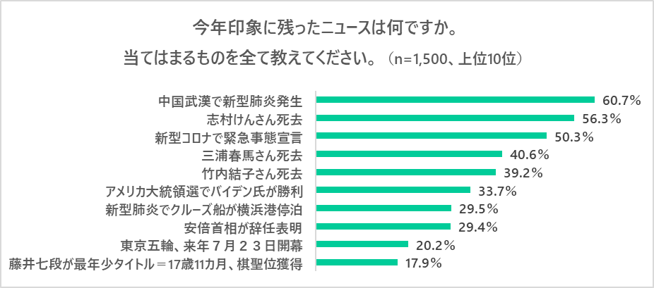 続いて、今年印象に残ったニュース(2020年11月5日時点)を複数選択で聞いたところ、1位に挙がったのは1月に発生した2020年を象徴する最も大きな出来事「中国武漢で新型肺炎発生」(60.7%)となりました。2位は新型コロナによる肺炎で3月に亡くなられた日本を代表するコメディアン「志村けんさん死去」(56.3%)、3位は4月に全都道府県に発令された「新型コロナで緊急事態宣言」(50.3%)、4位は7月に30歳という若さで亡くなられた「三浦春馬さん死去」(40.6%)、そして5位は演技派女優として注目をされつつも9月に亡くなられた「竹内結子さん死去」(39.2%)となりました。