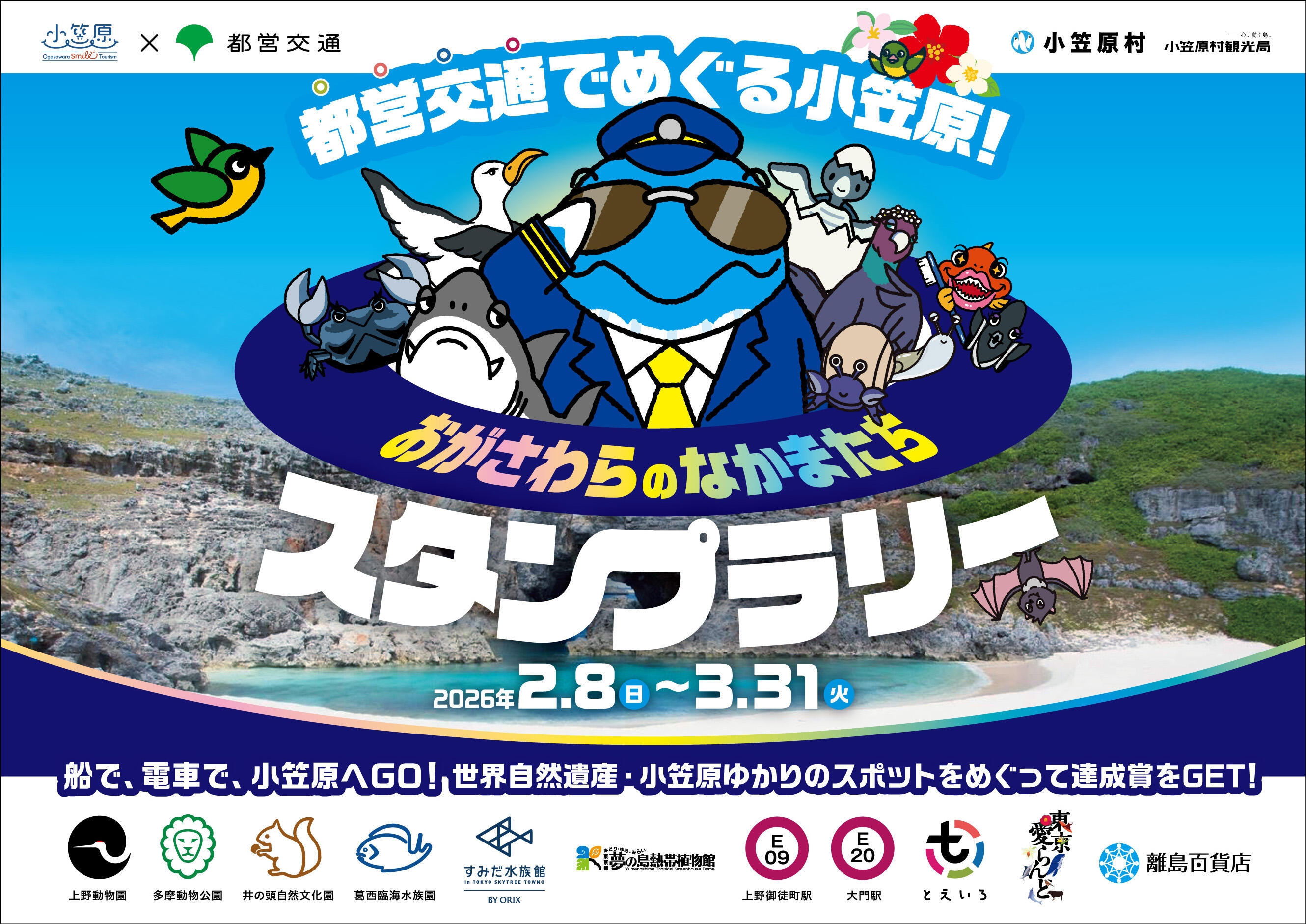 全国各地で旅行やお出かけの機会が増える春休みに合わせ、2026年2月8日(日)の「小笠原DAY」から同年3月31日(火)まで、島の希少な生きものや物産品と出会える小笠原ゆかりのスポットをめぐる"都営交通でめぐる小笠原!「おがさわらのなかまたち」スタンプラリー"を実施いたします。