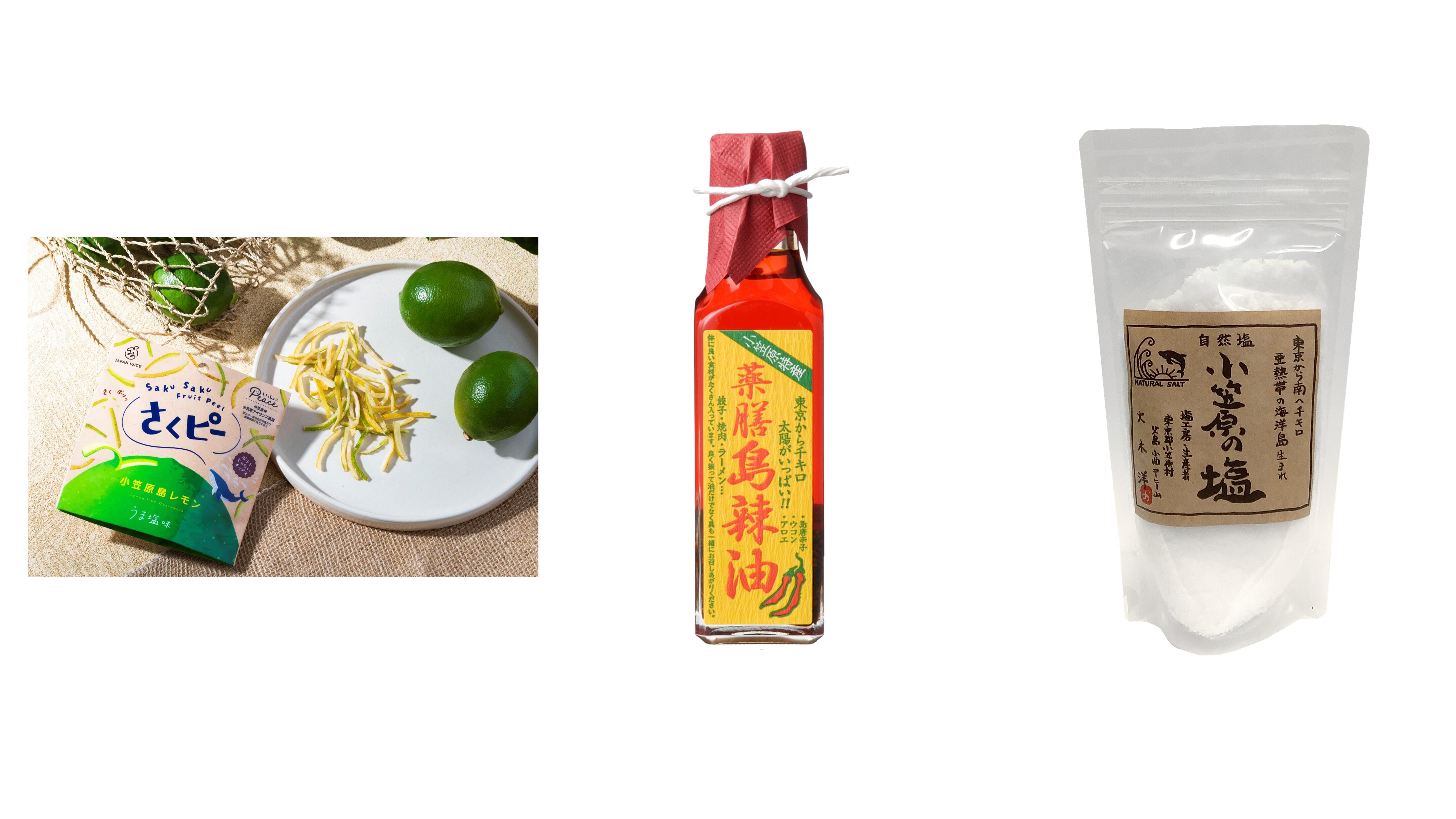 (左)さくピー(スナック菓子) (中央)薬膳島辣油 (右)小笠原の塩